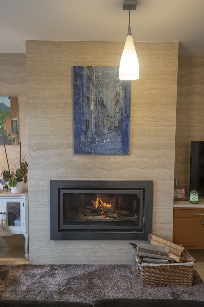 Reforma integral de piso en Palma con pavimentos de Travertino Romano Clásico a Ley Pulido , chimenea en Travertino clásico apomazado. Aplacados en baños de Granito Garwick pulido y encimera de cocina e isla en porcelánico blanco.